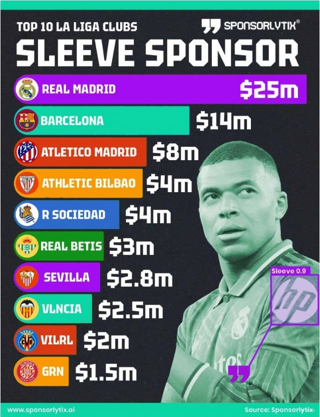 西甲各队袖标广告收入:皇马2500万美元居首,巴萨第二